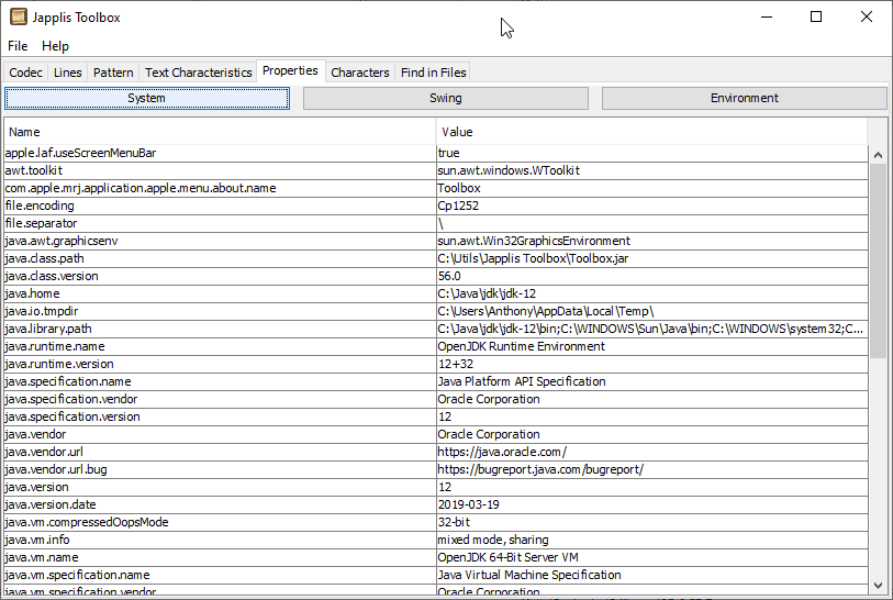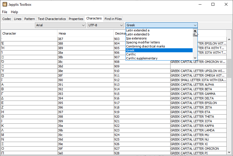 - Character map (Character, Hexadecimal, Decimal, Name, Main Category)